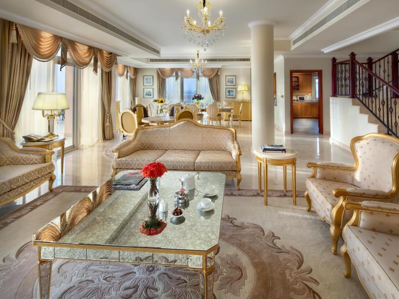 Интересный факт: по окончании строительства отеля в 1999 году, ему сразу же, причем самовольно, были присвоены 7 звезд. Есть за что. Каждый номер отделан сусальным золотом, различными дорогими благородными металлами . Более того, площадь гостиничных комнат поражает своей масштабностью: самая маленькая – 170 квадратных метров, самая большая – 780. Сутки проживания в этом отеле стоят около 23 тысяч американских долларов.