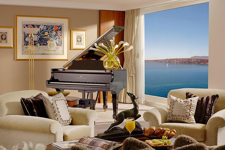 Из этого люкса площадью 1800 квадратных метров открывается панорамный вид на Женевское озеро и швейцарские Альпы. Люкс украшен тщательно подобранной коллекцией произведений искусства, а также собственной террасой площадью 1700 квадратных метров.